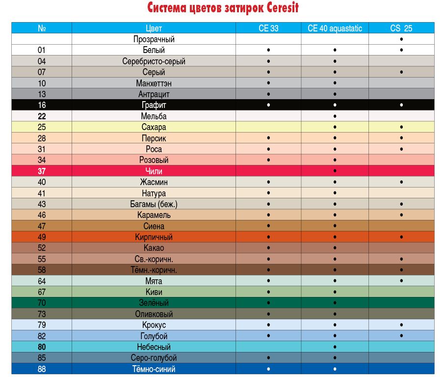 Оттенок цвета готовой затирки может незначительно отличаться от обозначения цвета на упаковке ввиду специфики техники печати на бумаге. Затирка приобретает заявленный цвет по истечении 24-48 часов, в зависимости от условий окружающей среды, после затирания швов, выполненного в соответствии с рекомендациями по применению.
